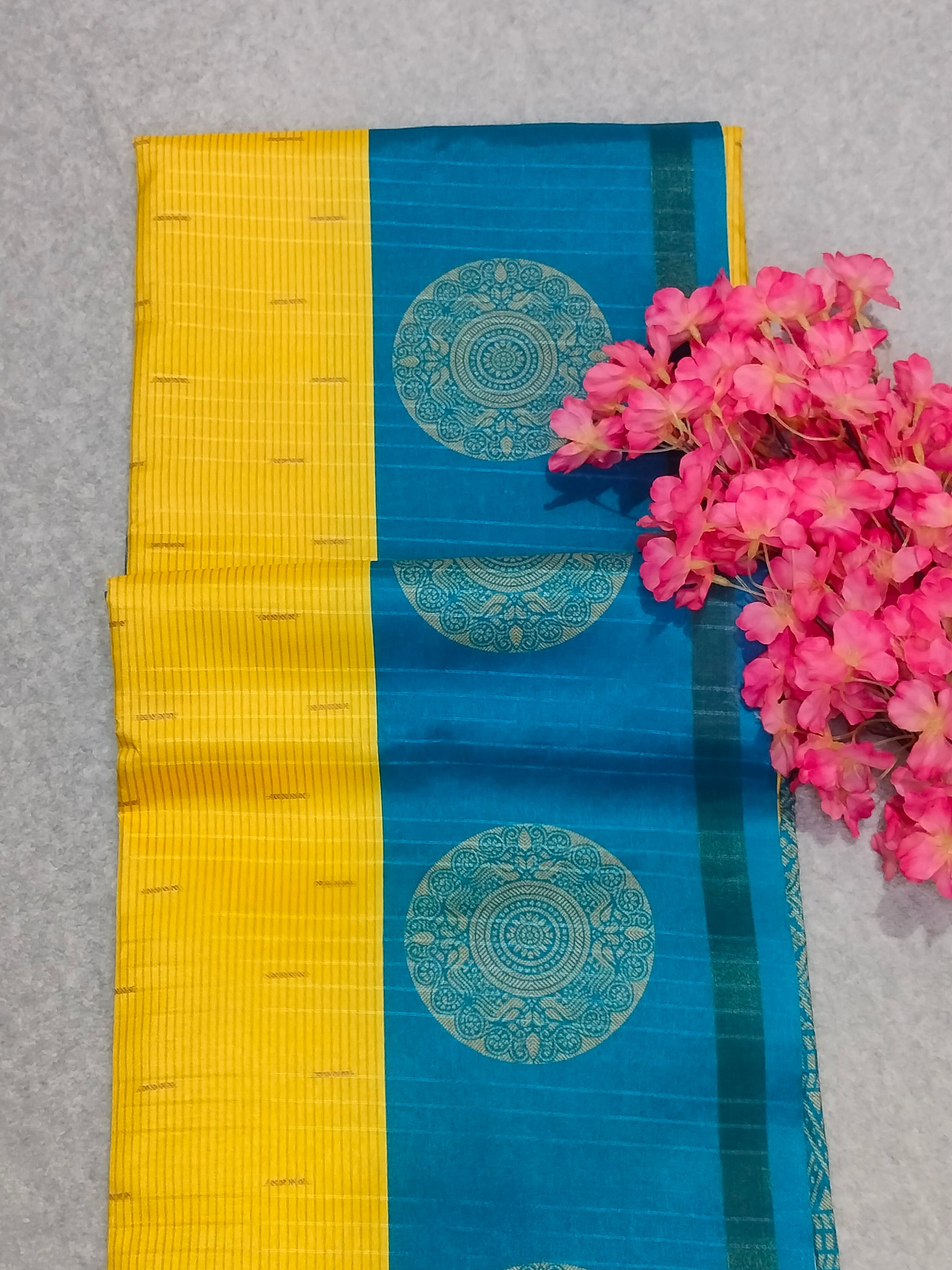 This Cotton Mix Yellow Saree features a striking blue border that adds a vibrant contrast to its soft cotton blend fabric. Lightweight and breathable, it offers comfort for extended wear, making it ideal for both casual and festive occasions. The elegant color combination enhances traditional appeal while ensuring ease of draping. Perfect for those seeking a balance of style and comfort in daily ethnic wear.