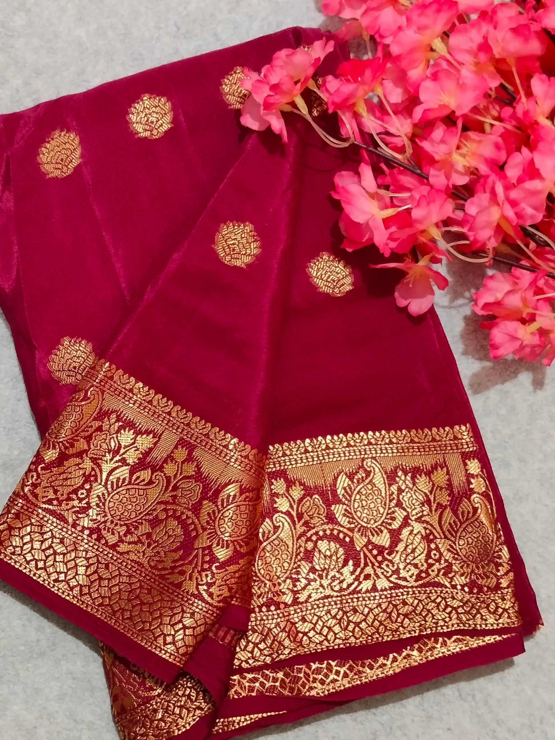 Elevate your collection with this Crape Viscous Silk Saree in a rich dark pink shade, intricately adorned with delicate flower butta motifs throughout. The luxurious viscous silk fabric offers a smooth drape and subtle sheen, ensuring both comfort and elegance. Perfect for festive occasions or formal events, this saree blends traditional craftsmanship with contemporary style, making it a timeless addition to your wardrobe.