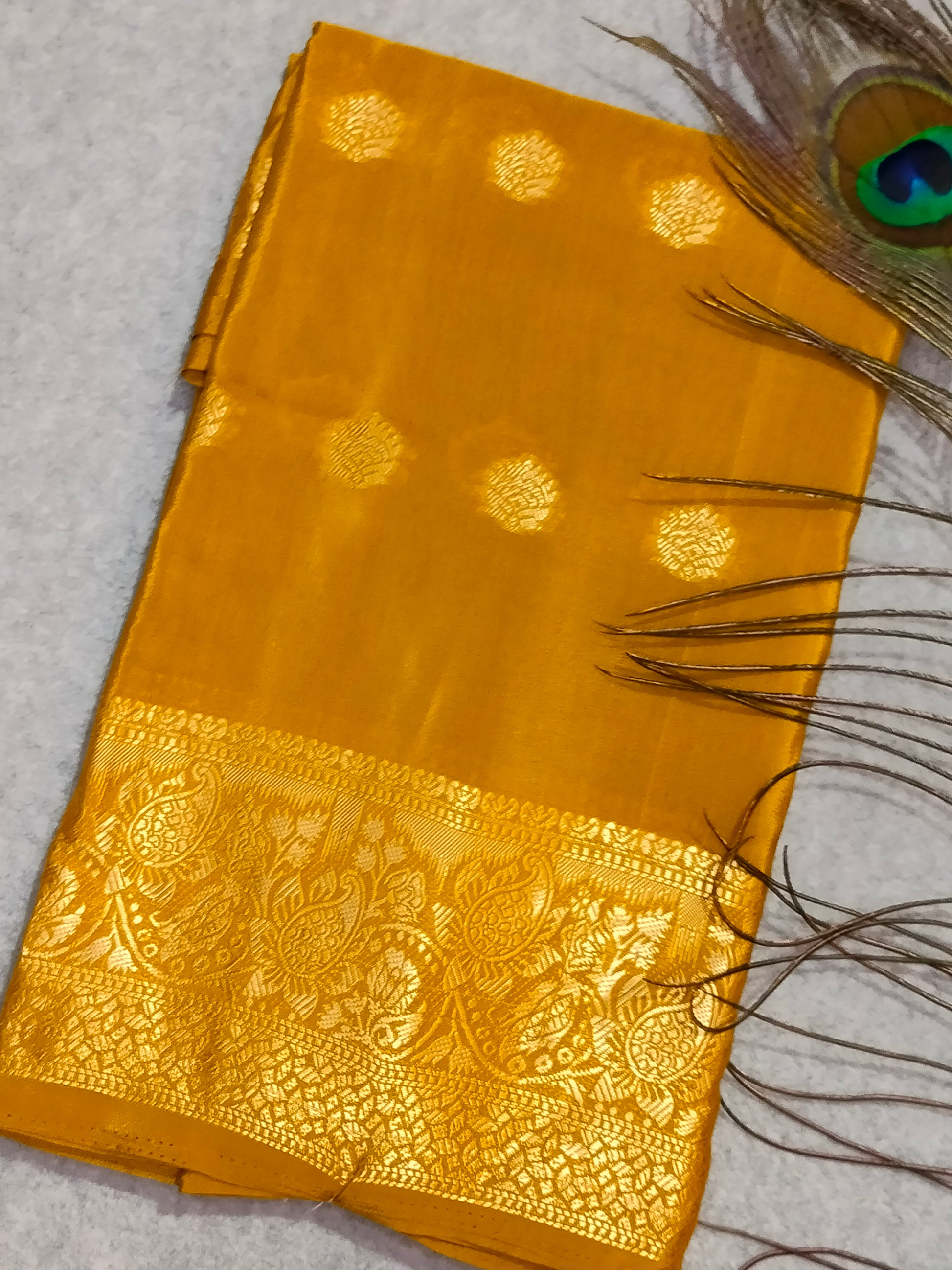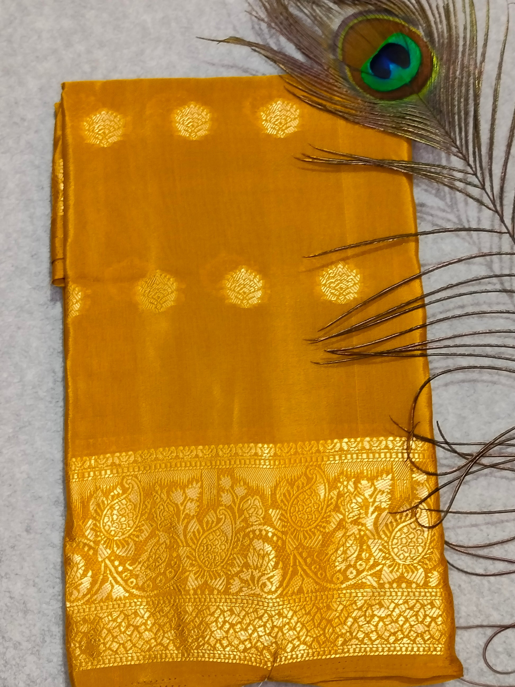 This gold-colored crape viscous silk saree showcases delicate flower butta patterns spread elegantly across the fabric. Crafted from soft, flowing material, it offers a refined drape and a luxurious feel, ideal for formal events and traditional celebrations. Its intricate design and rich texture highlight expert craftsmanship, making it a distinguished addition to any wardrobe.