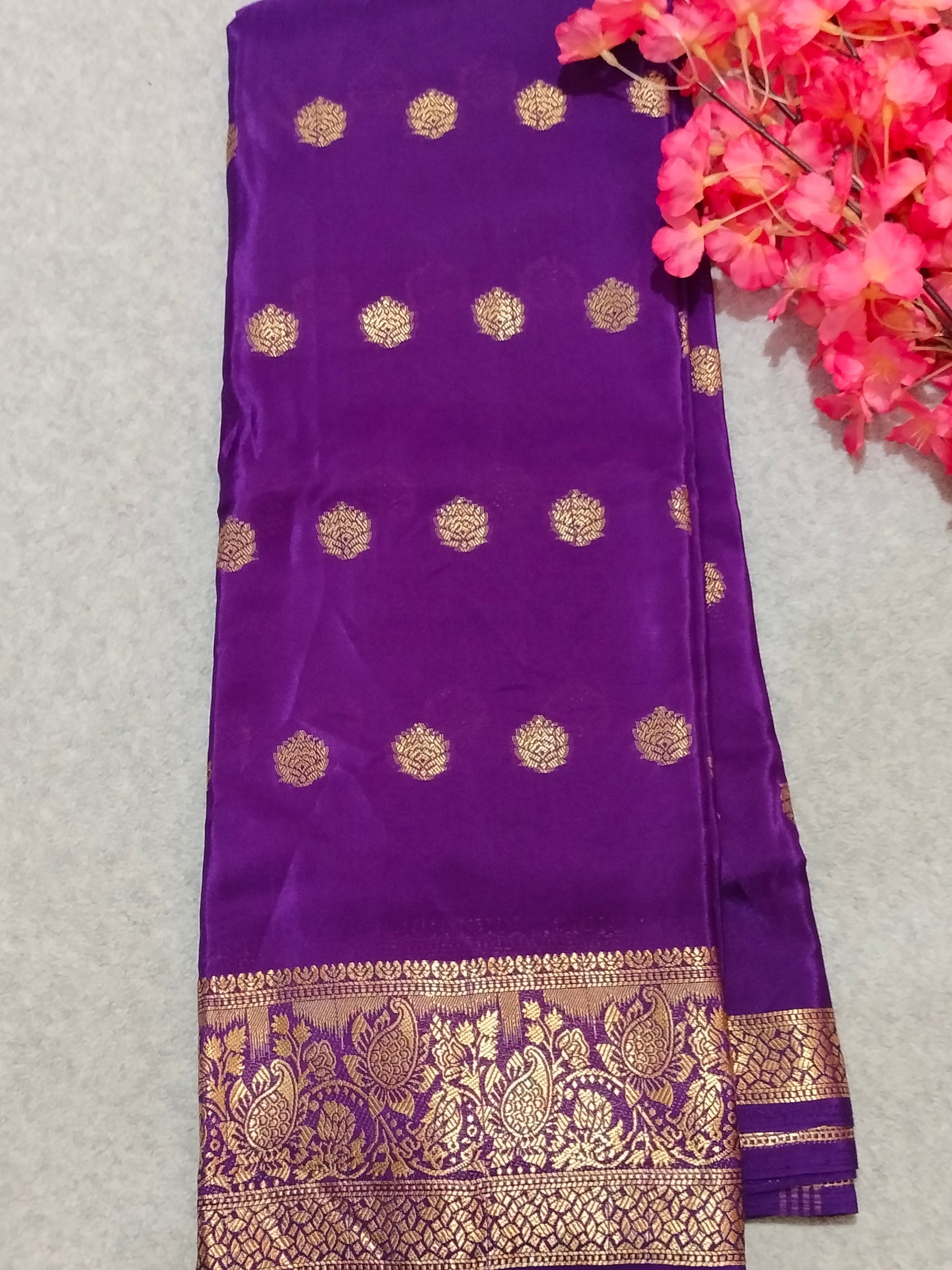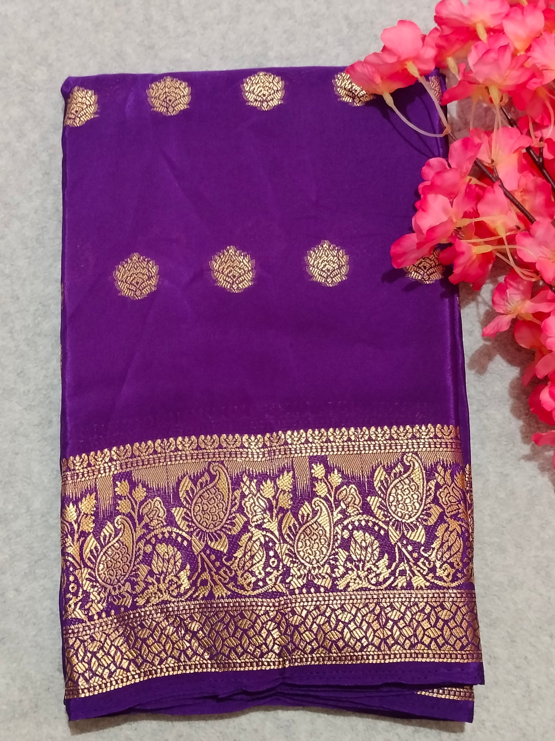 This Crape Viscous Silk Saree features a rich purple shade adorned with delicate flower butta motifs all over, combining classic elegance with modern comfort. The soft, flowing fabric provides a graceful drape, perfect for formal occasions and festive celebrations. Its expert craftsmanship ensures both durability and timeless style.