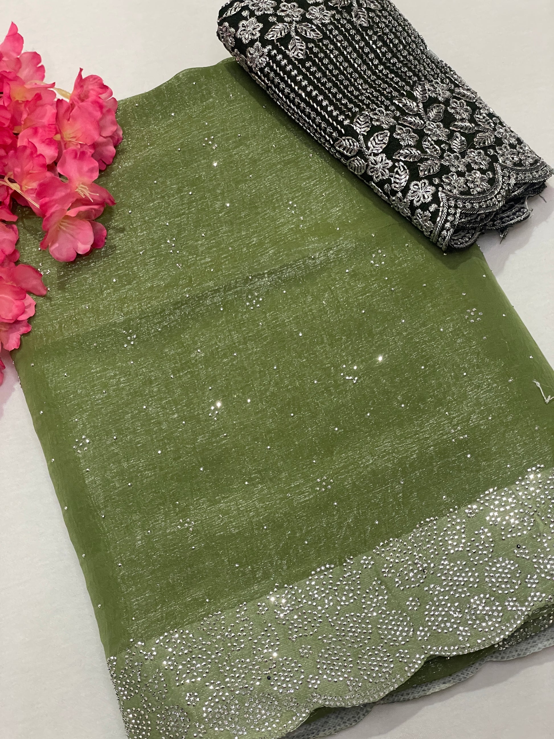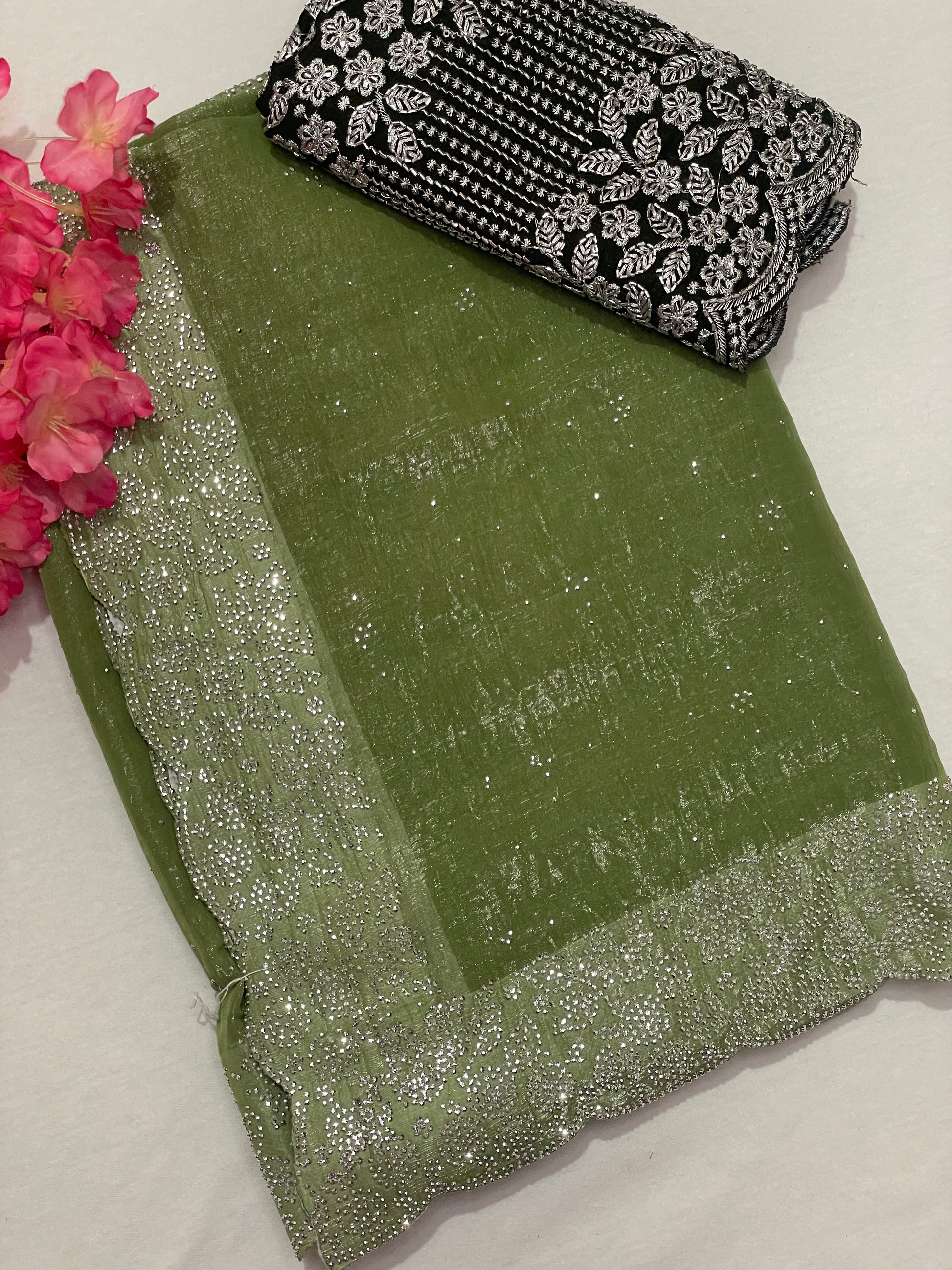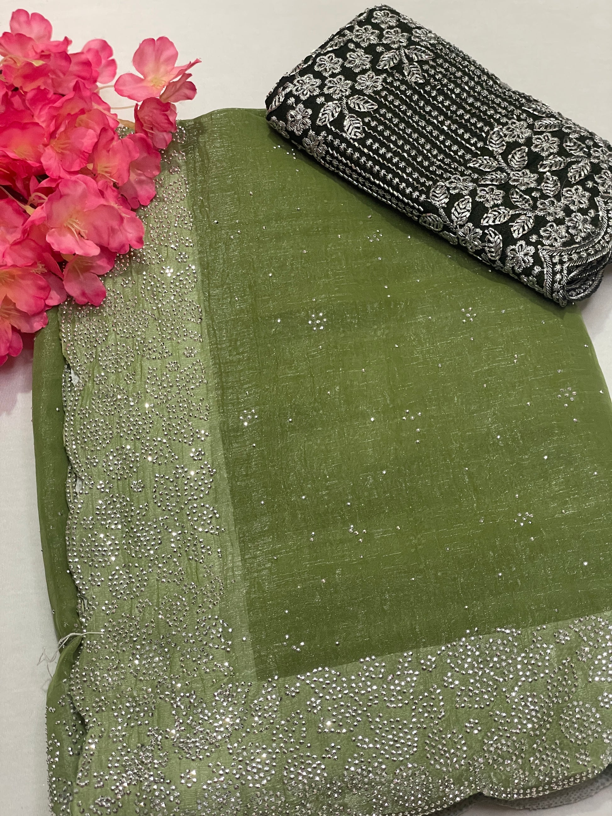 This crushed soft designer saree in a vibrant green shade features intricate white stonework delicately adorned throughout the fabric. Its lightweight texture ensures comfort while enhancing elegance, making it an ideal choice for festive occasions and formal events. The subtle shimmer from the stone embellishments adds a refined sophistication, perfectly complementing the graceful drape of the saree.