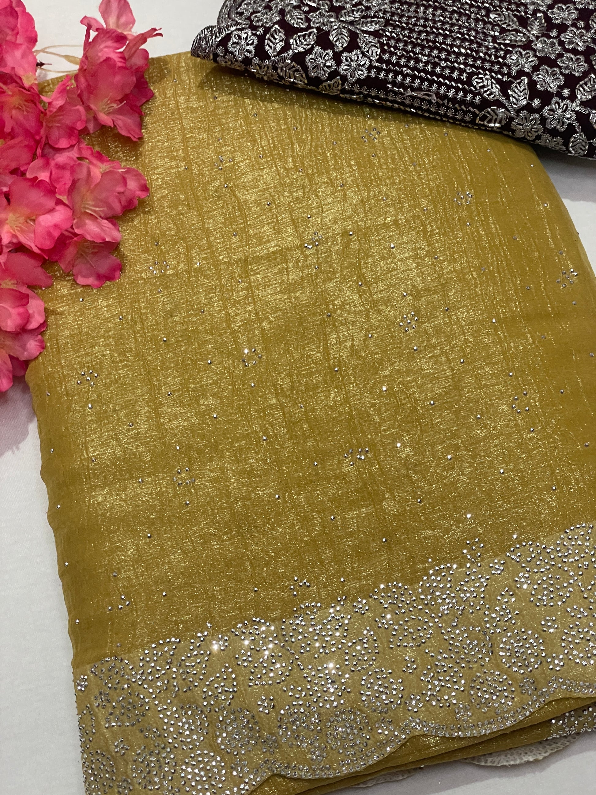 This crushed soft mustard saree features exquisite stonework that adds a touch of refined elegance to its designer texture. Combining a lightweight, breathable fabric with intricate embellishments, it offers both comfort and sophistication, making it perfect for festive occasions and formal events. The delicate stone detailing enhances the saree’s rich mustard tone, creating a graceful and timeless ensemble.
