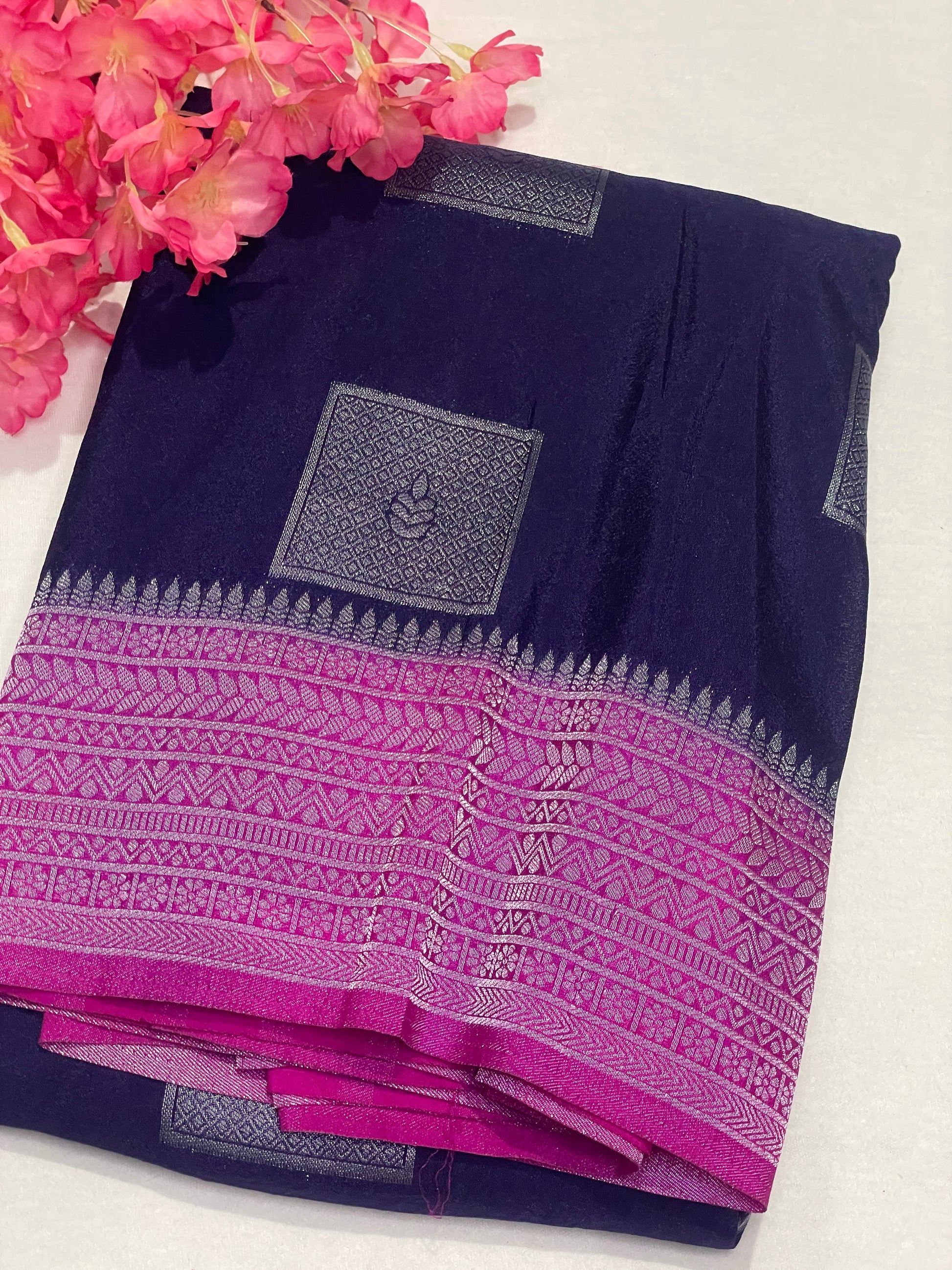 This Georget Soft Saree features a sophisticated geometric pattern, perfectly balanced with an elegant silver thread border. Crafted for a refined look, it offers a lightweight, comfortable drape that enhances your silhouette, making it ideal for formal occasions and celebrations. The silver threading adds a subtle yet striking shimmer, ensuring you stand out with grace and style. Perfect for those seeking a blend of traditional design and modern elegance.