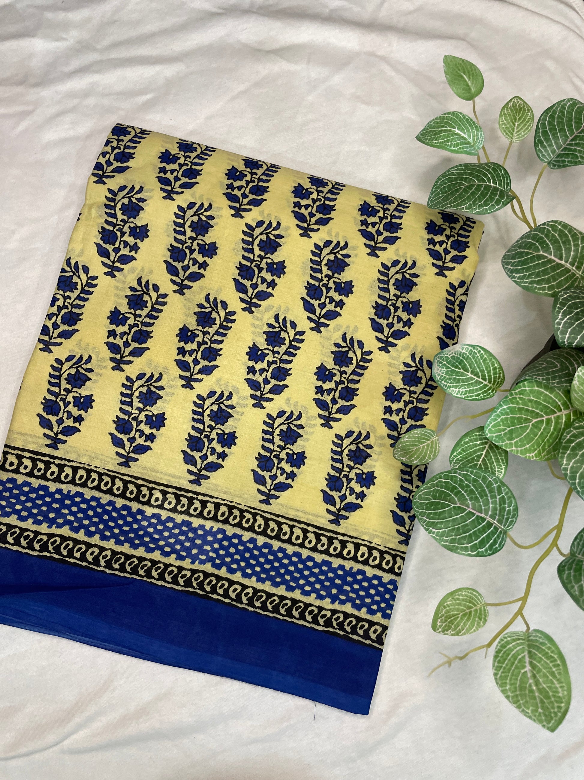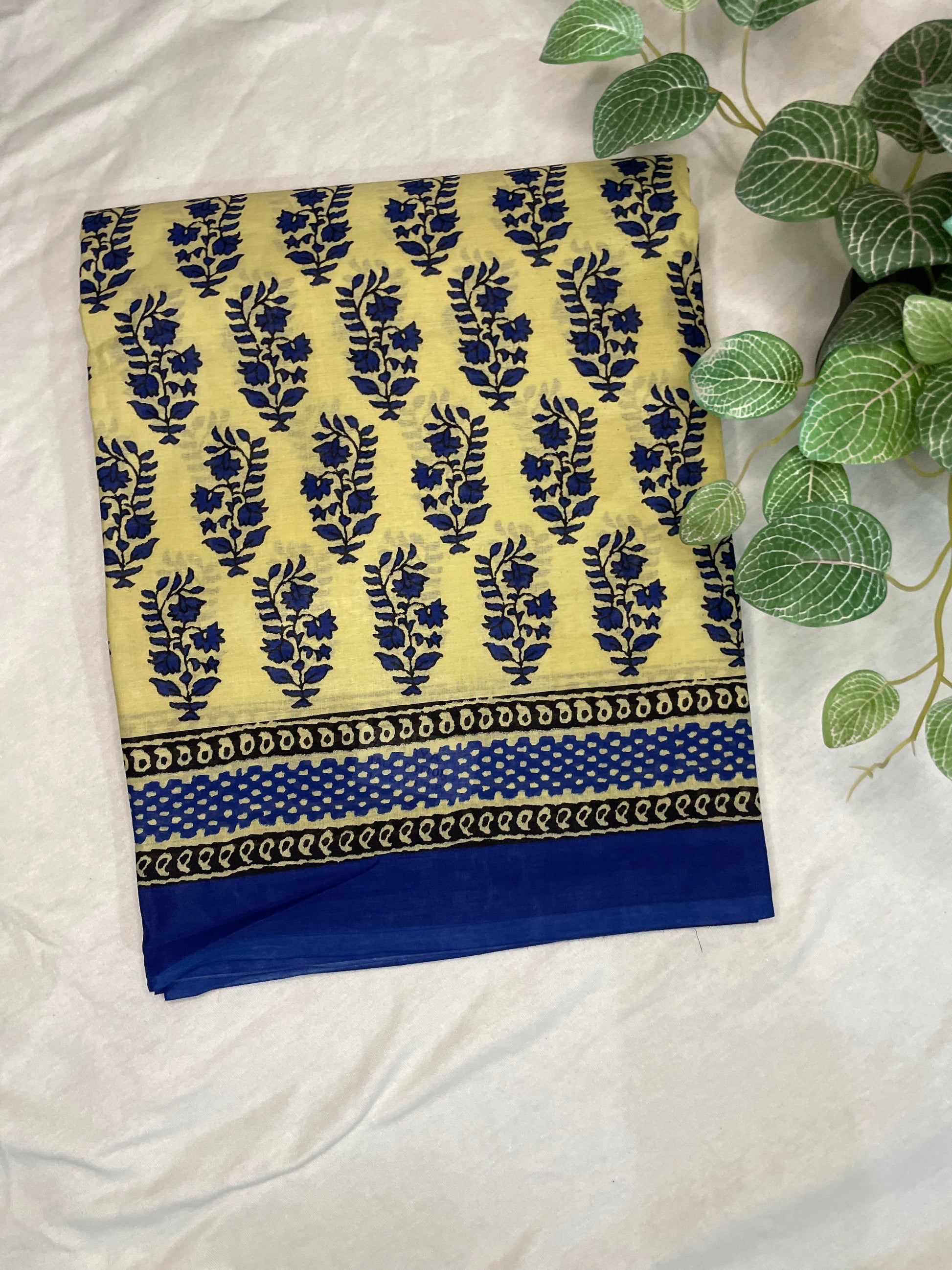 This Mul Cotton Cream Saree with a blue border exemplifies expert craftsmanship combined with comfort. Made from premium mul cotton, it offers breathability and softness for all-day wear. The subtle cream tone contrasted by the prominent blue border provides a refined and elegant appearance, suitable for formal events and traditional gatherings. Its durable fabric ensures lasting quality, while the classic design enhances your ethnic collection with understated sophistication.