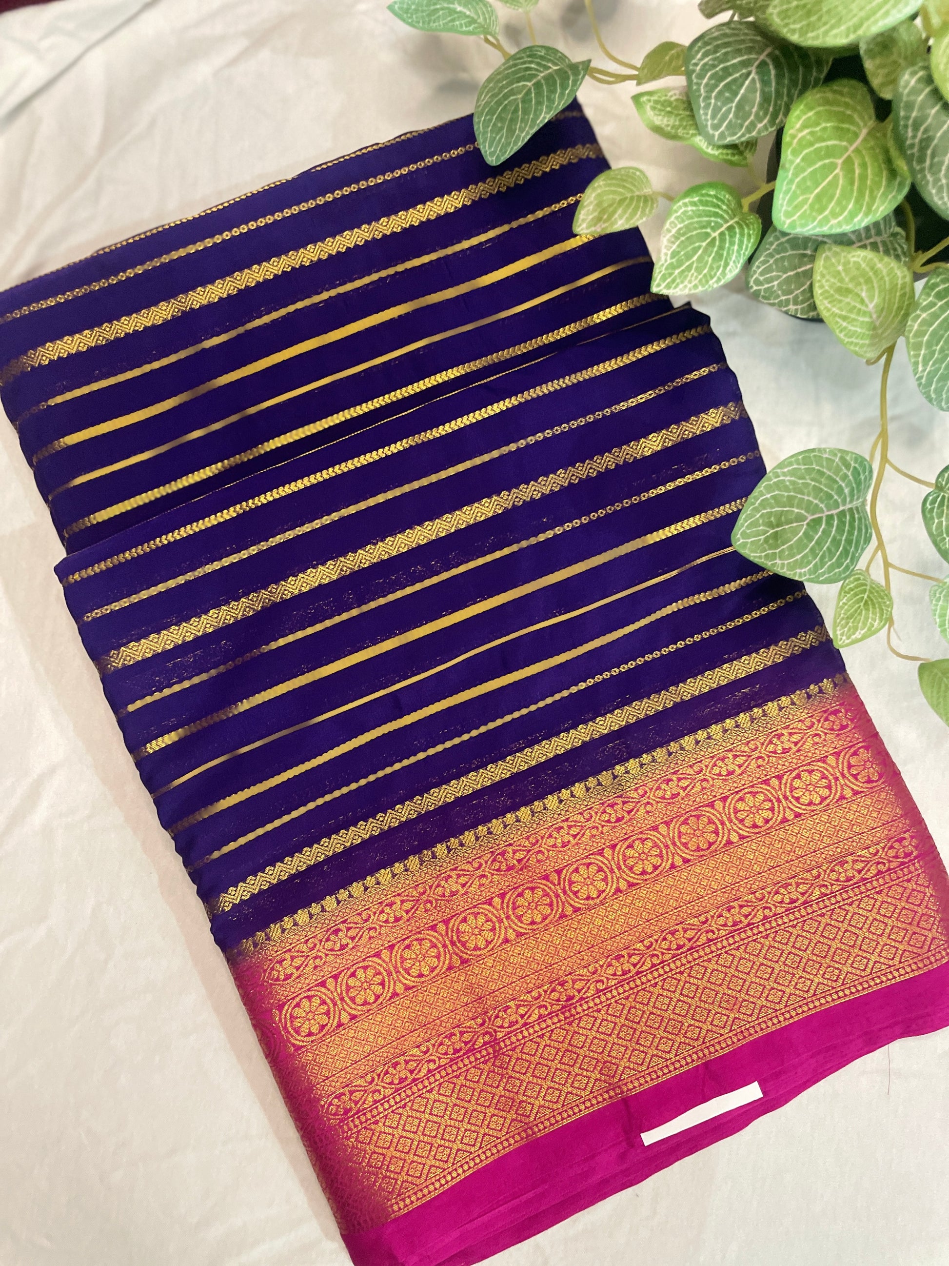 This Mysore Semi Crape Saree in blue features a smooth, semi-crape texture that offers drape and comfort ideal for both formal and casual occasions. Its breathable fabric ensures all-day wearability, while the subtle sheen enhances an elegant silhouette. Perfectly balanced between traditional craftsmanship and modern style, it provides a refined look suited to a variety of events.
