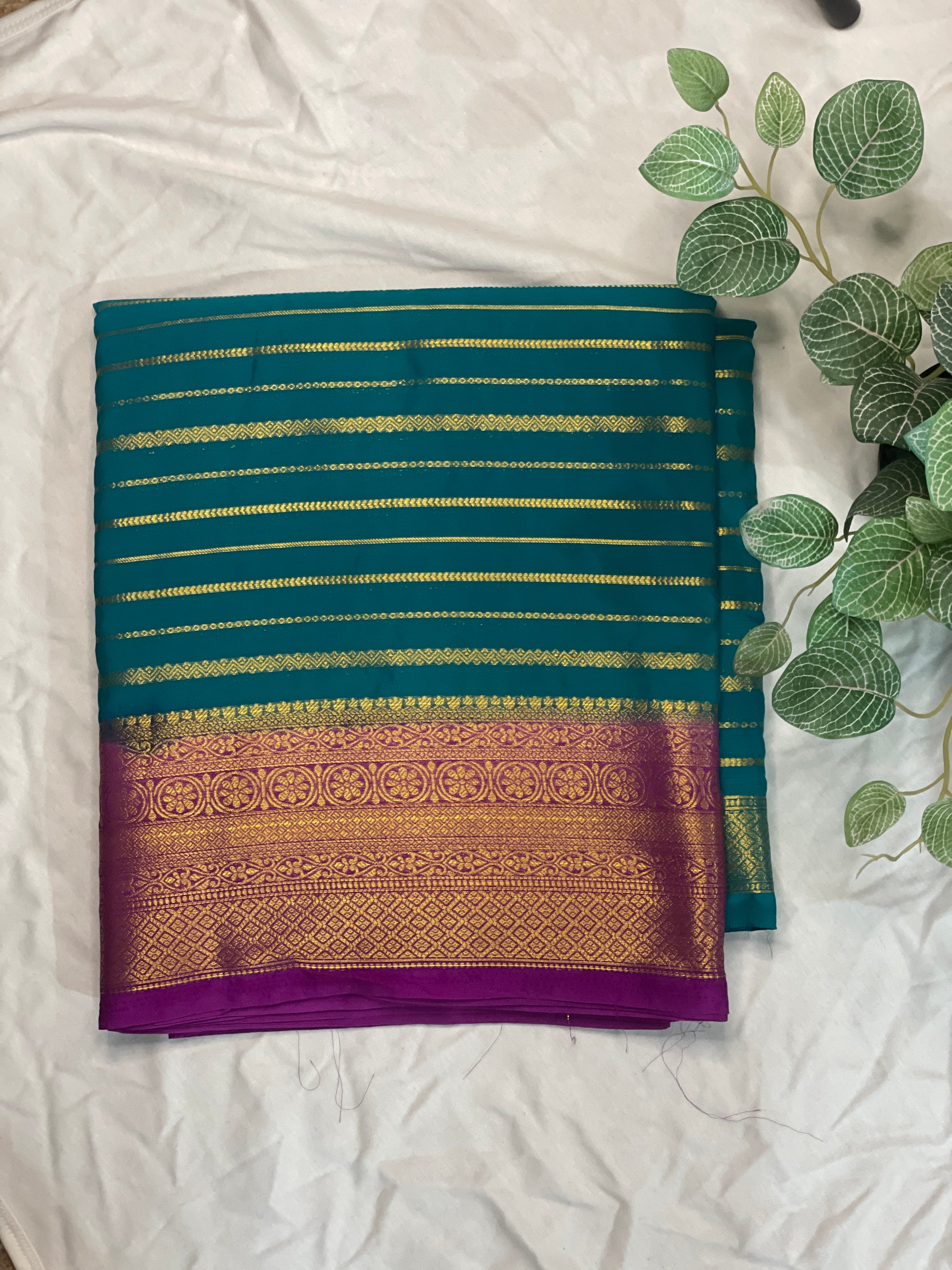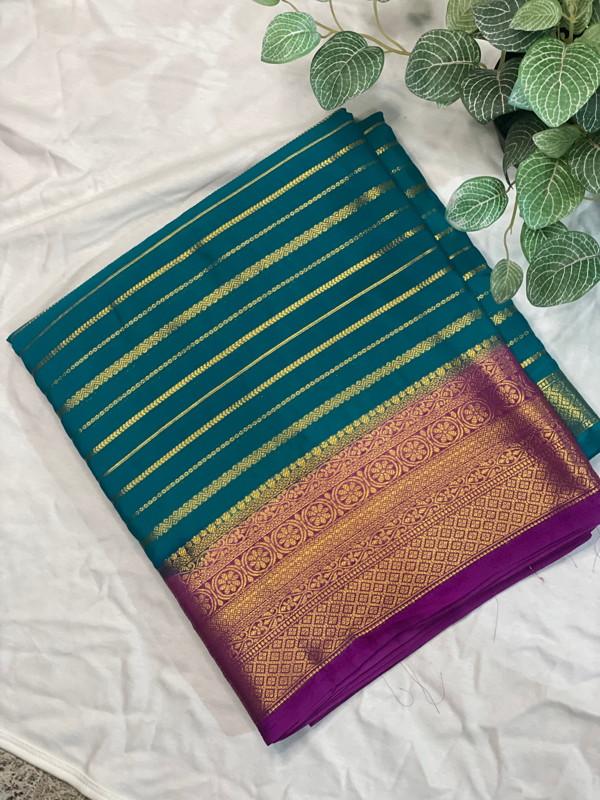 Crafted from premium Mysore semi crepe silk, this green saree offers a refined texture with subtle sheen, perfect for formal and festive occasions. Its lightweight fabric ensures comfort while draping gracefully, highlighting traditional elegance with modern appeal. Ideal for those seeking a sophisticated yet understated silk saree.