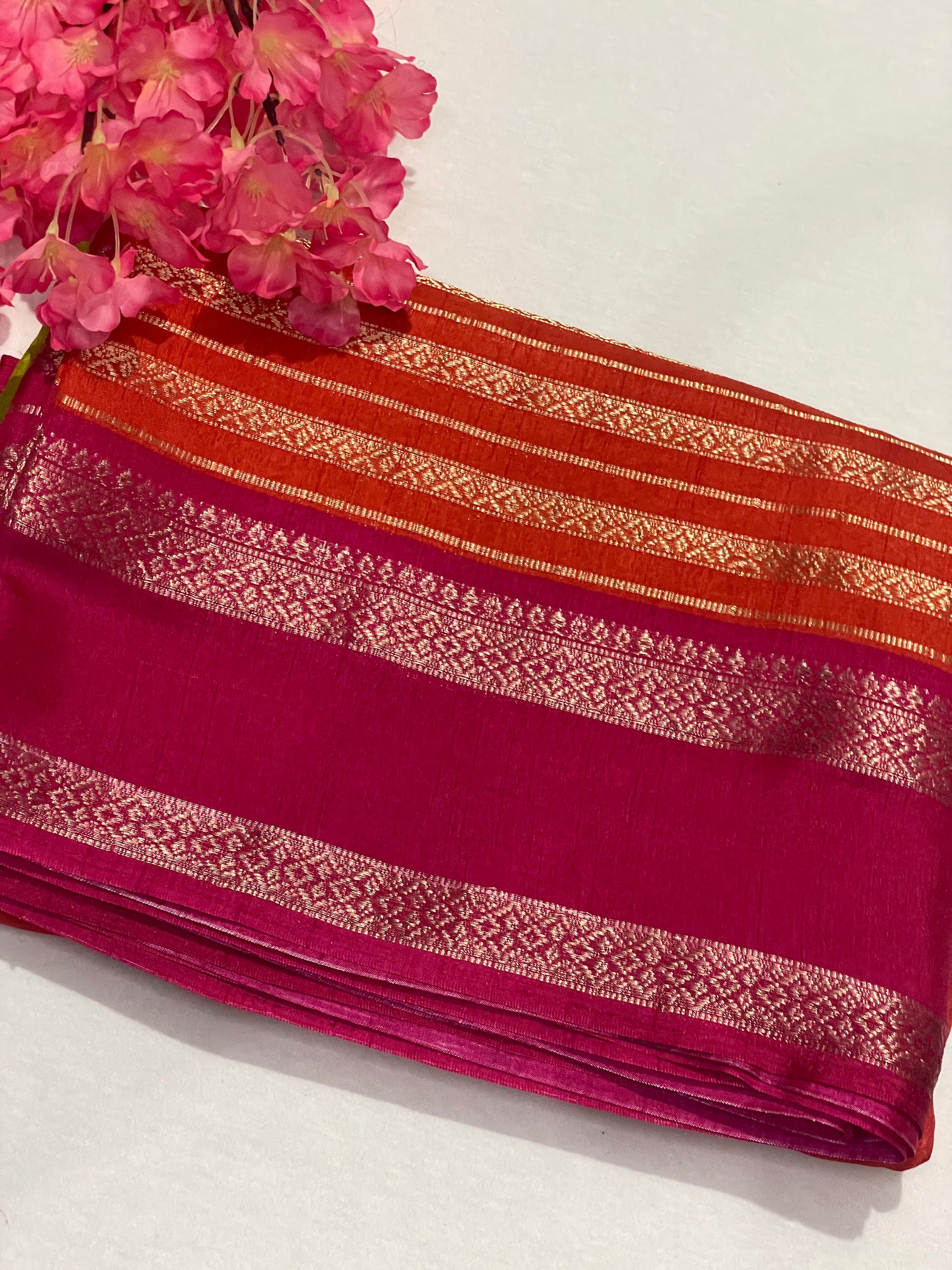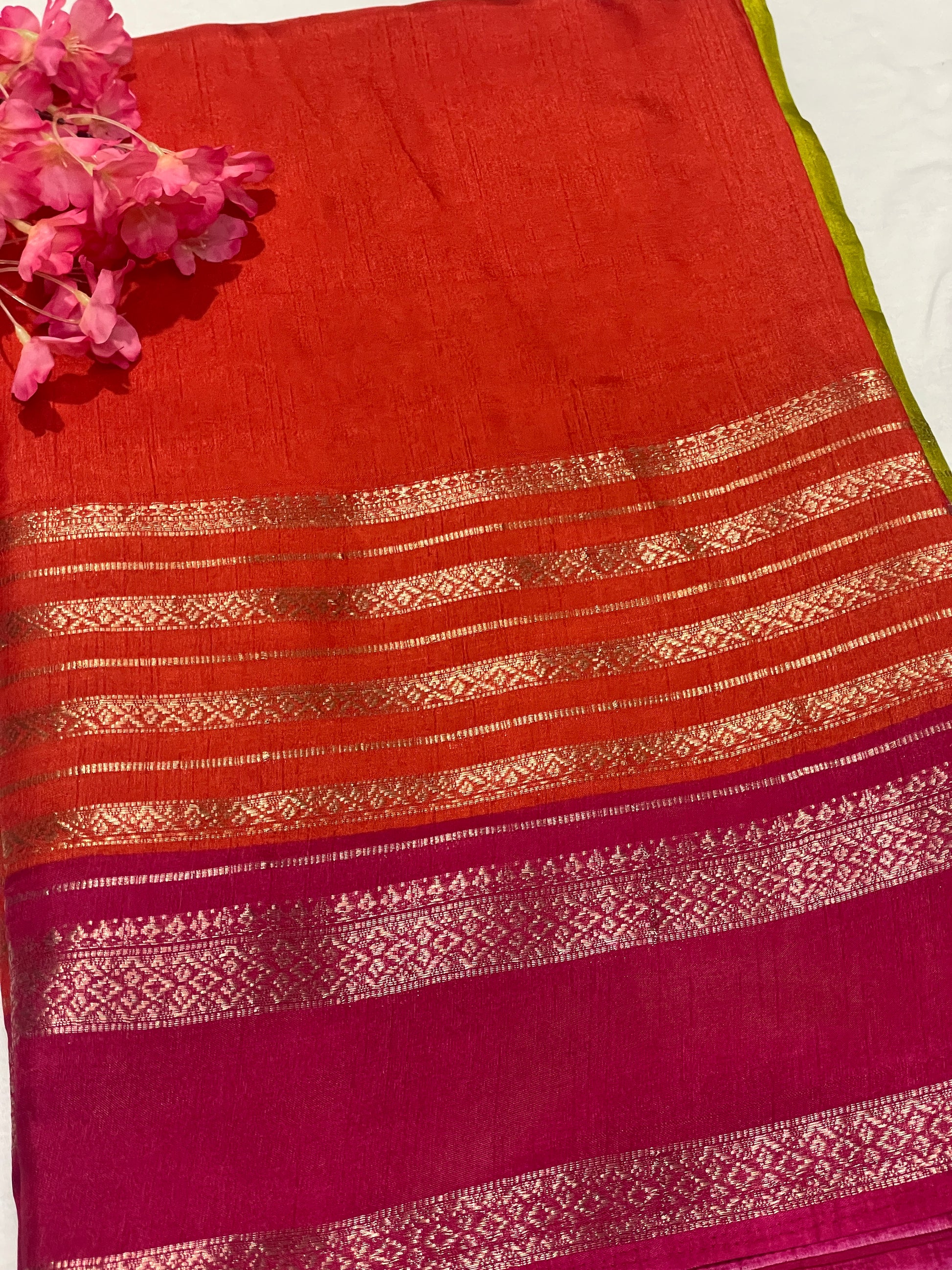 This Silver Stripes Orange Semi Crape Saree combines elegance with contemporary style. Crafted from semi-crape fabric, it offers a graceful drape and comfortable wear. The subtle silver stripes add a refined shimmer, perfectly complementing the vibrant orange base. Ideal for festive occasions and formal events, this saree ensures a sophisticated yet striking appearance.